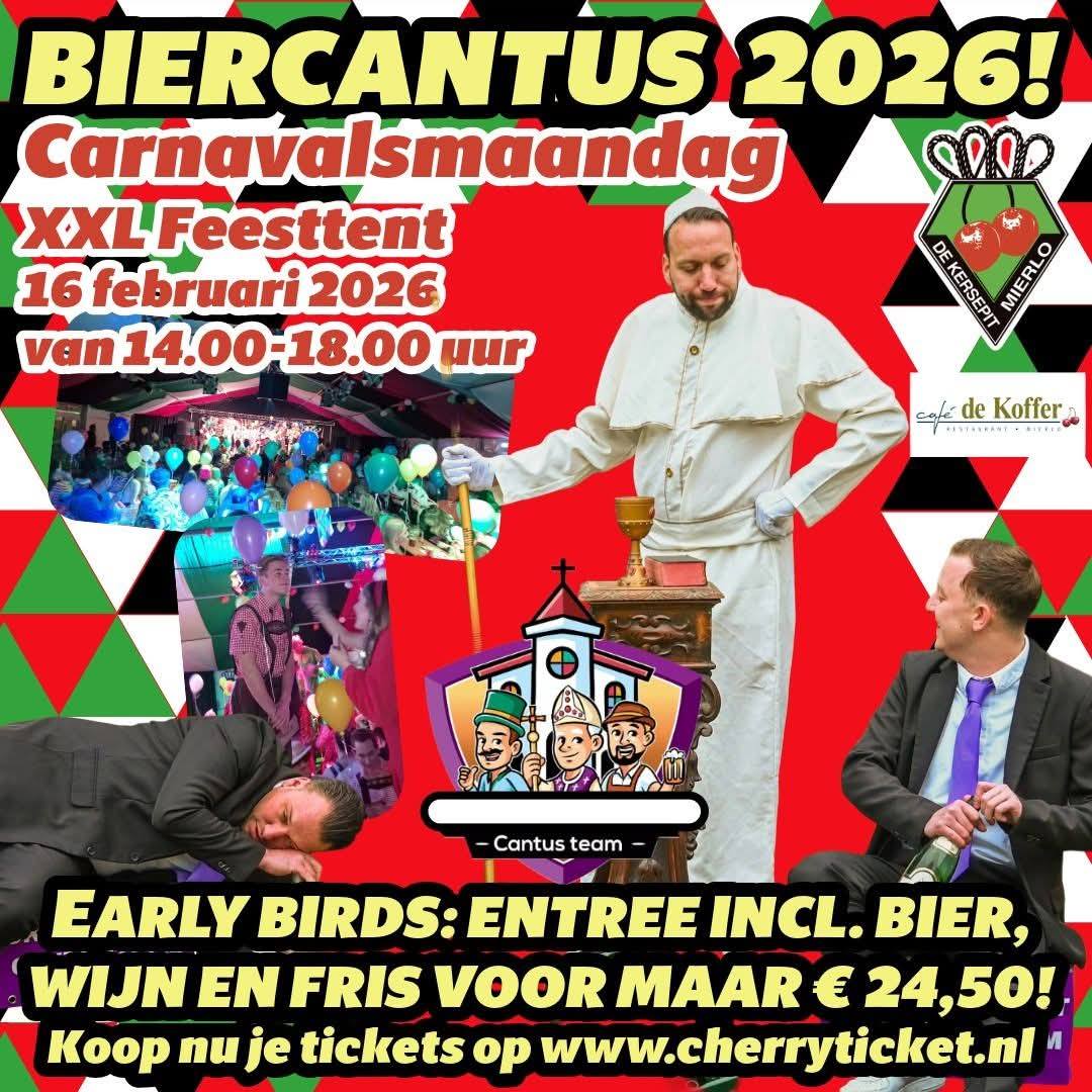 Men neme ballonnen, lange tafels, strenge Cantusleiders en veel pullen bier: hét recept voor een fantastische middag. Bereid je voor op een te gekke middag vol onverwachte opdrachten, leuke straffen en natuurlijk meezingers! Durf jij de uitdaging aan? Voor slechts €24,50 ben jij verzekerd van een hele middag carnaval onder vrienden, want bier, wijn of fris zijn bij de prijs inbegrepen. kaarten zijn te koop in onze webshop www.cherryticket.nl