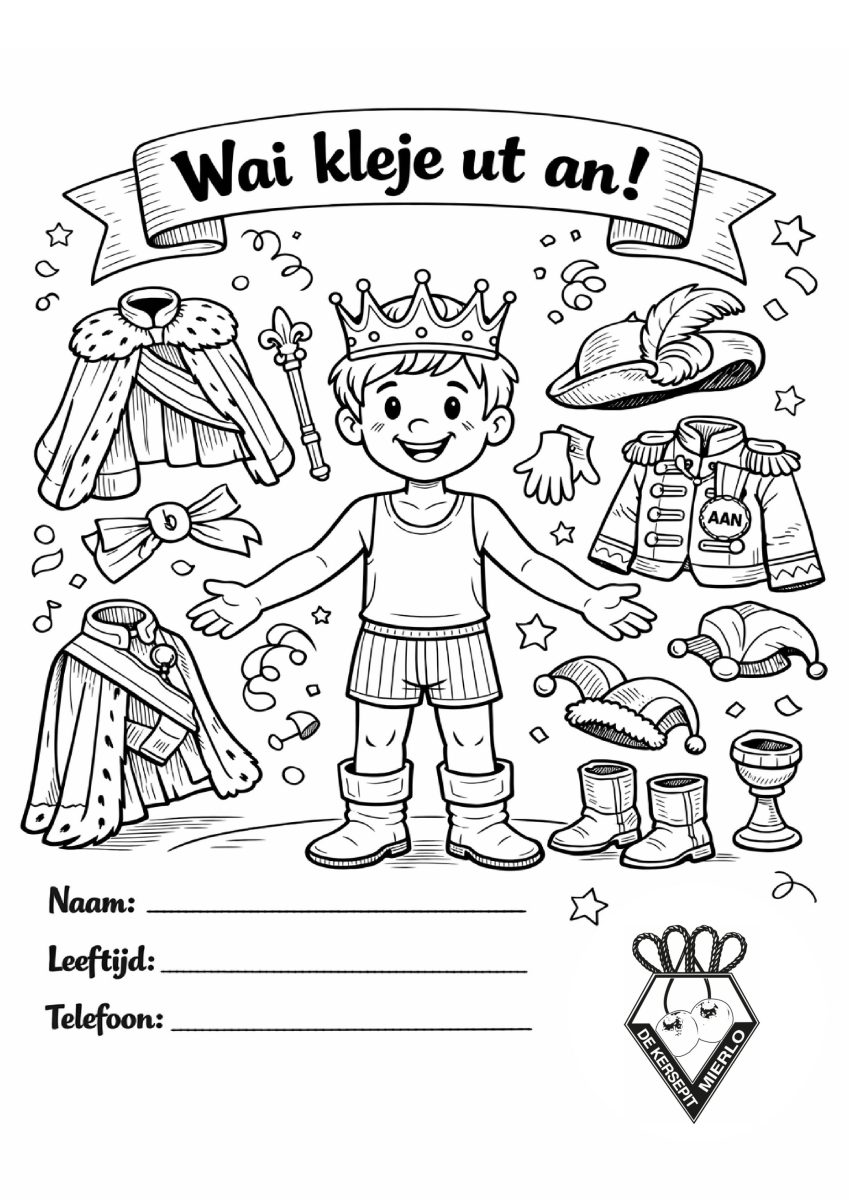 Print deze kleurplaat uit in het groot om er een mooi kunstwerk van te maken. Als je ‘m af hebt, neem ‘m dan mee als je komt carnavallen bij De Kersepit op zondag- en/of maandagmiddag. Misschien vindt Prins Ruud die van jou wel de allermooiste en dat verdient natuurlijk een prijs!